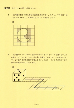 図形問題は、大問3(第三問)として4問出題されています。 対策としては、これも上の問題集などで問題のパターン毎に解き方を覚えて下さい。 そして、見慣れない問題に出会っても解き方を迷わないように、出来るだけ多くの問題を解いて下さい。