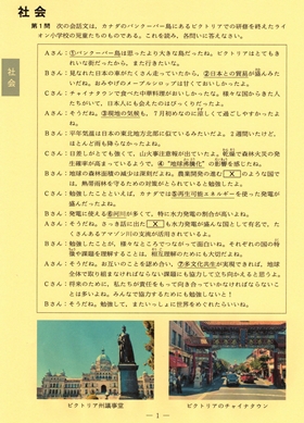 社会は第1問から第3問までの大問3個からなり、例年「地理・歴史・政治」から万遍なく、「国際」から小問が1~2個出題されています。 単に知識を問う問題だけではなく思考能力を問う問題や計算問題もあり、宮城県内の私立中学校の入試問題としては良く出来ています。