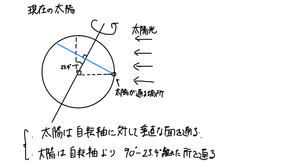 そうすると、上図の2つの原則が成り立つことがわかります。 地軸の傾きが22°になった時にこの2つの原則を当てはめてみると、太陽は「自転軸に対して垂直な面を通る」、かつ、高さは90°-22°高い場所を通るということになります。